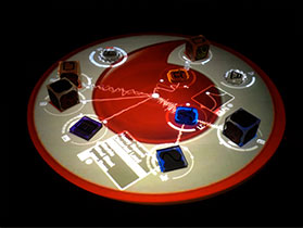 The Reactable is an electronic musical instrument with an interactive tabletop screen, that uses glass cubes and pucks to create music and manipulate sounds when placed and rotated on the multitouch surface. Drum Machine uses this instrument to sync loops and samples with modulators, when building live music.